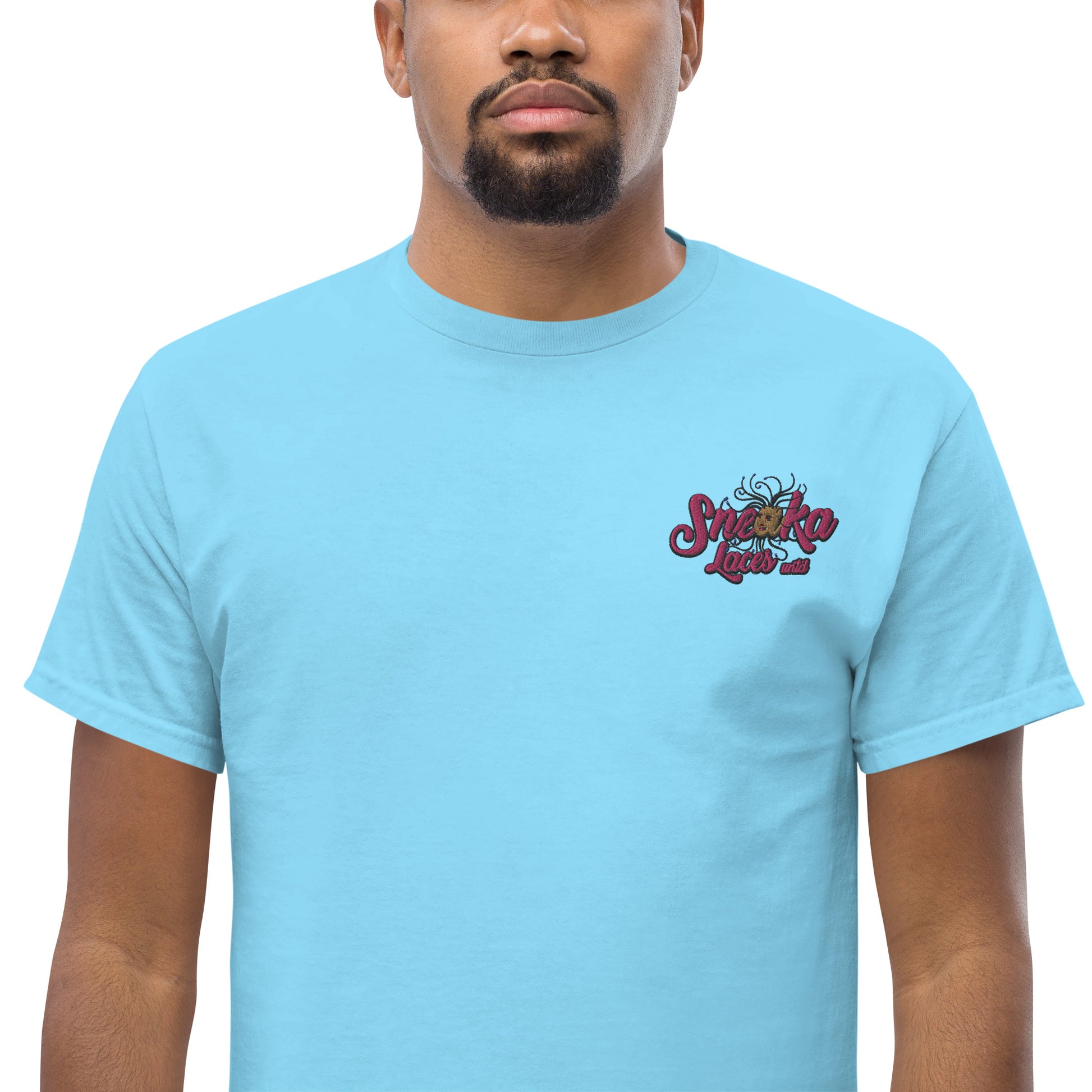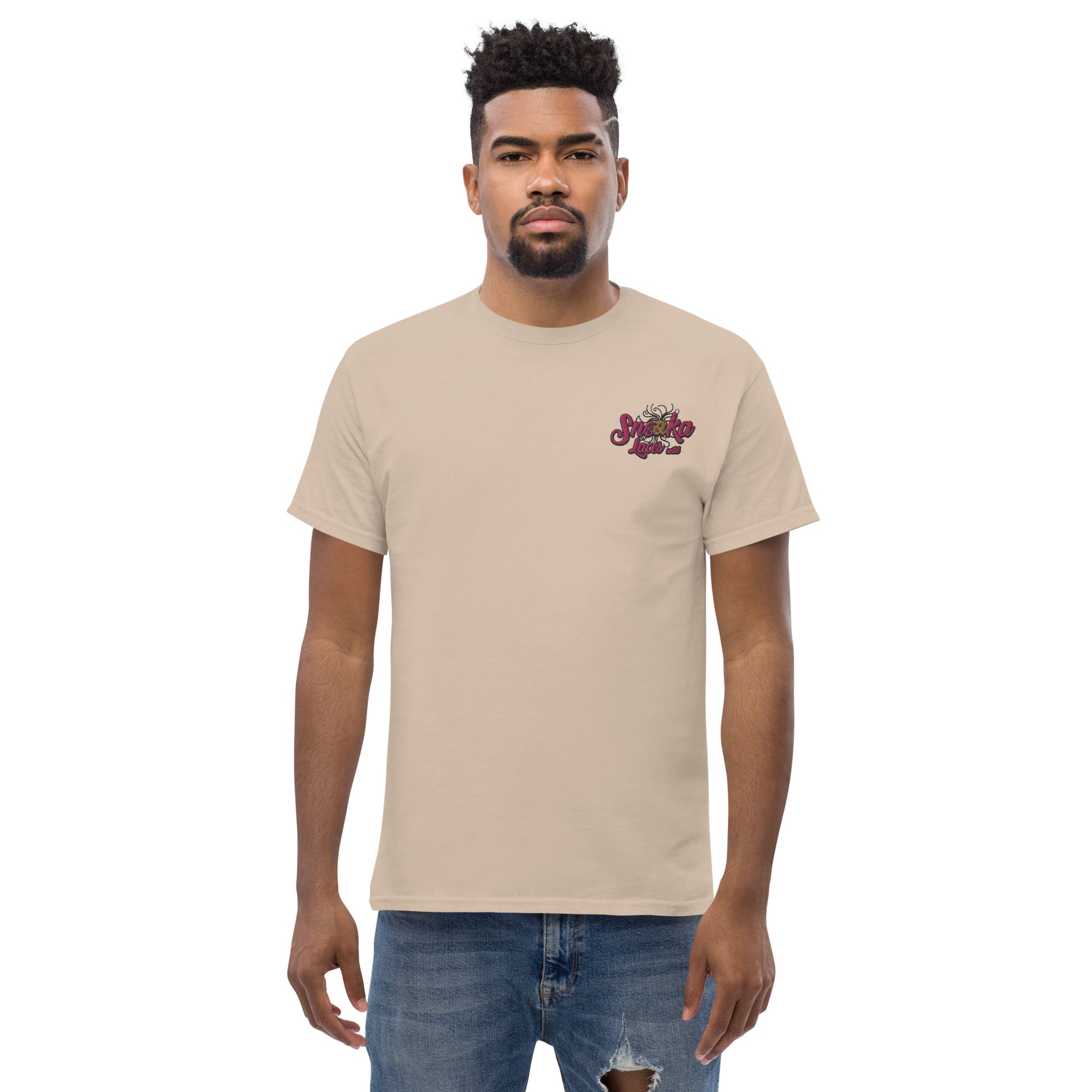 The 100% cotton men's classic tee will help you land a more structured look. It sits nicely, maintains sharp lines around the edges, and goes perfectly with layered streetwear outfits. Plus, it's extra trendy now!